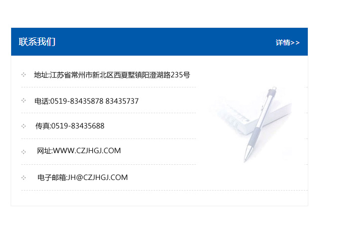 地址:常州市新北區(qū)友邦商務(wù)大廈1幢16、17層  電話:0519-85101652  傳真:0519-85112595  郵編:213022  網(wǎng)址:www_cz-jiayue_cn.heyuanhuamei.com  郵箱:xiajifengaa@163.com